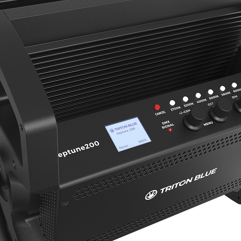 Panel LED Soft profesional modelo Neptune 200. Potencia de 200W con fuente de luz RGB, blanco cálido y blanco frío. Temperatura de color (CCT) ajustable de 2700K a 10000K. Ángulo de haz de 110°. Modos de color CCT, HSI y RGBW. Dimmer con resolución de 8 o 16 bits y curvas seleccionables. Control mediante protocolos DMX512, RDM, Art-Net y sACN. Conectores de alimentación PowerCON REAN y de señal XLR de 5 pines. Chasis fabricado en aluminio fundido con sistema de refrigeración por ventilador. Alimentación universal 100-240V.