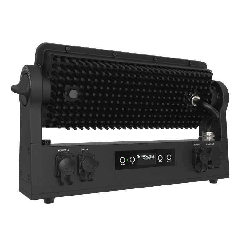 El Triton Blue Kosmos 270 IP65 es un washer LED profesional compacto y robusto para exterior e interior, que combina 27 LED de 10 W RGBW con ópticas seleccionables de 15°, 25° y 45°. Ofrece un flujo de hasta 14.800 lm (25°) y 9.650 lux a 5 m (8°), con temperatura de color ajustable de 2.400 K a 8.000 K para igualar tungsteno, luz día o crear atmósferas específicas. Su cuerpo IP65 y la disipación pasiva (sin ventiladores) garantizan funcionamiento silencioso y fiable en eventos, teatro, televisión y arquitectura efímera.