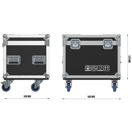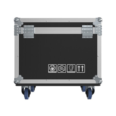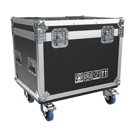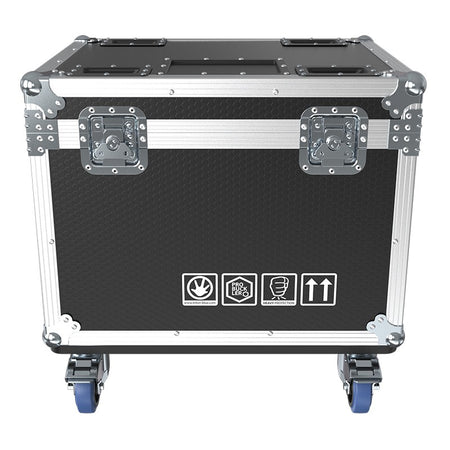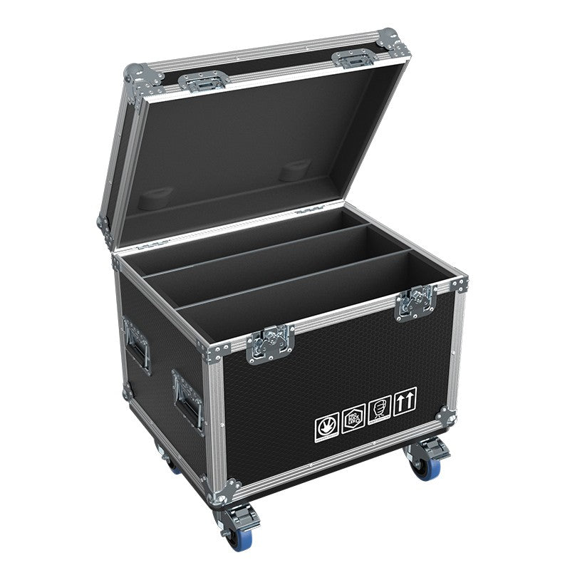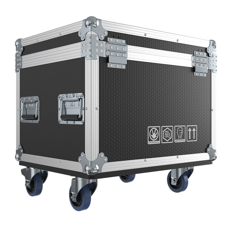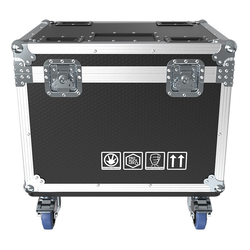 Flightcase para el transporte y almacenamiento de dos unidades de cabeza móvil Triton Blue Kosmos 1000 IP65. Estructura fabricada en madera contrachapada de 9 mm con cubierta exterior en material PROBUCKER negro de alta durabilidad. Perfilería perimetral de aluminio de 35 mm. El equipamiento incluye 4 asas empotradas, 2 cierres de mariposa y 4 ruedas giratorias de goma, de las cuales 2 incorporan sistema de freno. La tapa superior dispone de alojamientos para permitir el apilado de unidades. Interior con divisiones y espuma de alta densidad cortada a medida. Dimensiones exteriores (con ruedas): 640 x 570 x 470 mm.