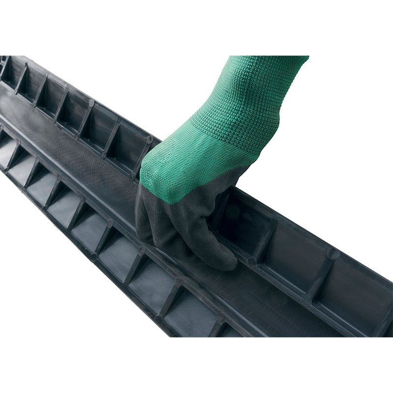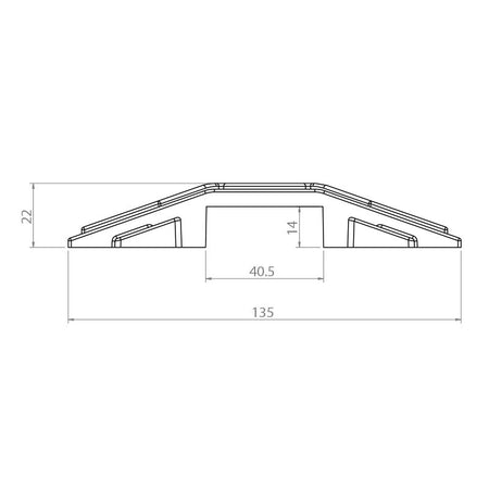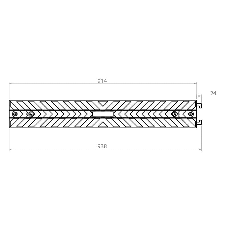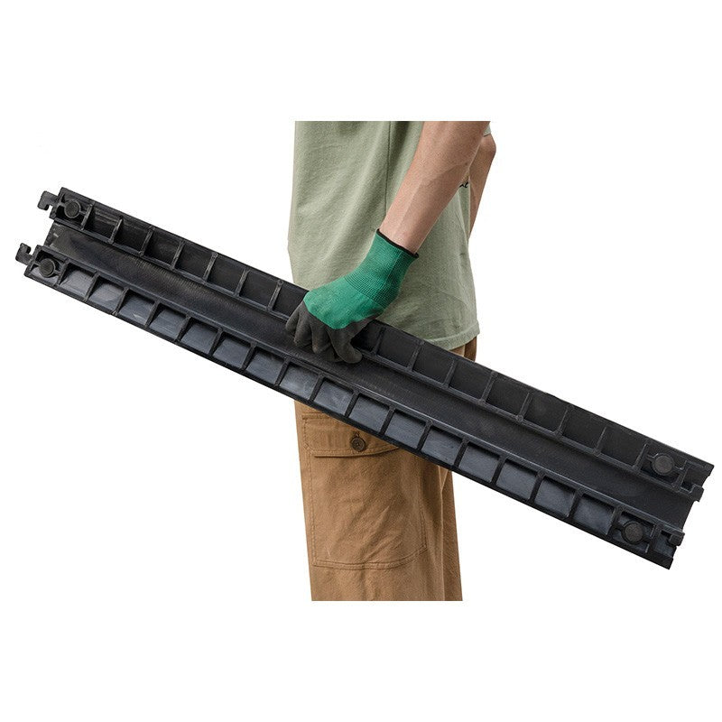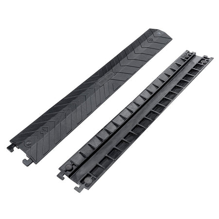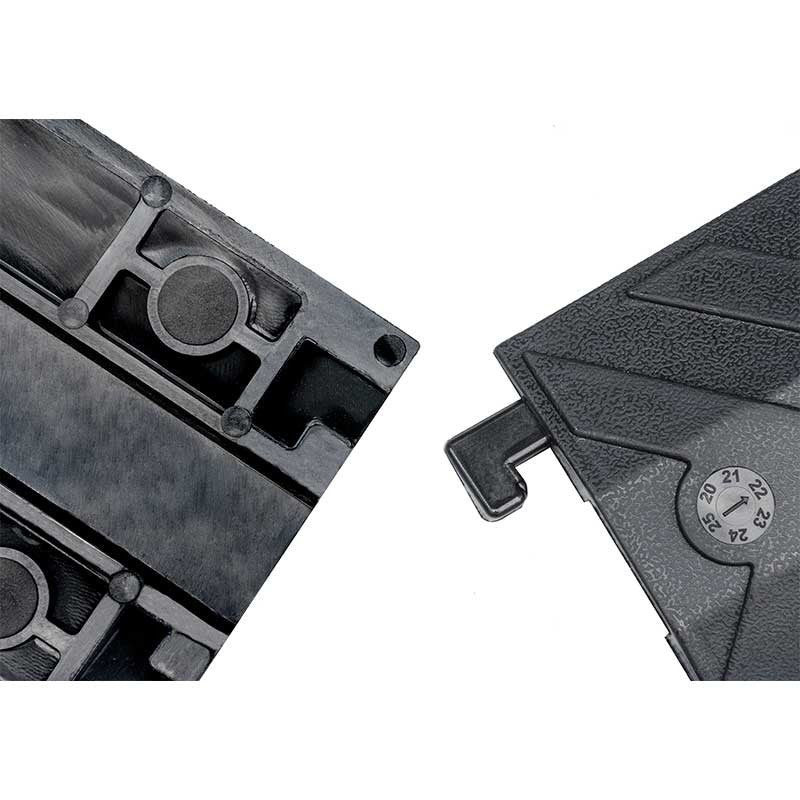 Pasacables de 1 canal, dimensiones 914 × 135 × 21 mm (L × A × H); canal interior 40 × 14 mm (ancho × alto). Base en caucho vulcanizado, acabado negro; superficie antideslizante; conectores macho/hembra y sistema de bloqueo para encadenar. Resistente a aceites, ácidos e hidrocarburos. Peso ≈ 1,8 kg. Ocupación máx. del canal ≤ 70 %. Uso recomendado con cables ≤ 500 V.