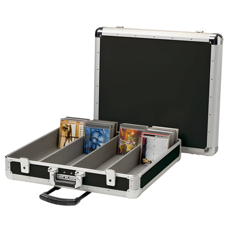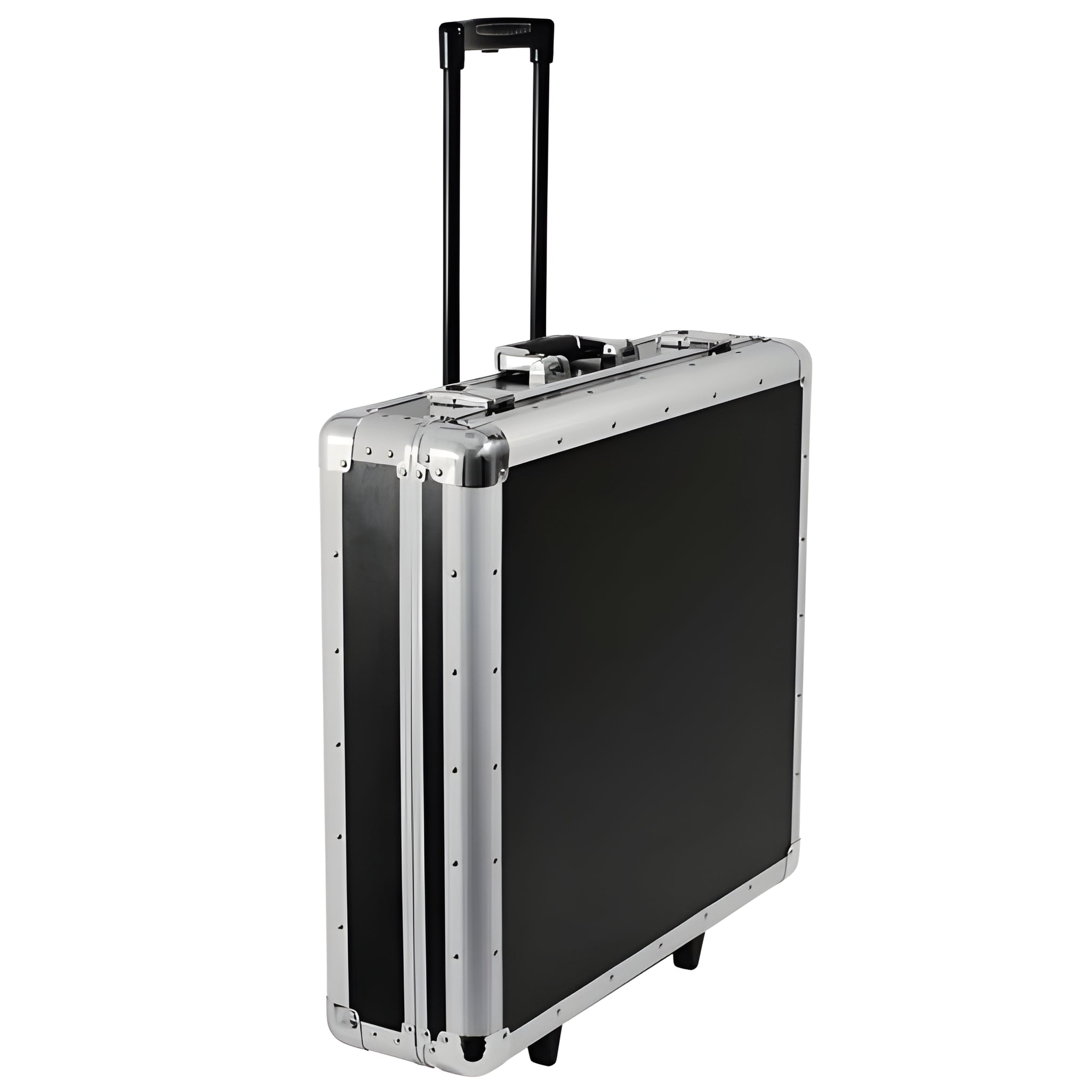 Maleta trolley para ~200 discos de 12 cm; estructura de madera con revestimiento de aluminio; interior con espuma acolchada y 4 divisiones; asa telescópica, 2 ruedas y asa superior; 2 cierres tipo mariposa con bloqueo; tapa extraíble; dimensiones externas 613 × 559 × 170 mm (An × F × Al); peso 6,6 kg; color negro.