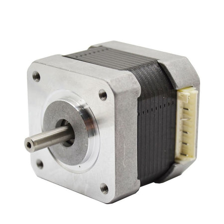 Motor paso a paso híbrido, estándar NEMA 17, con un tamaño de carcasa de 42 x 42 mm. Presenta un ángulo de paso de 1.8 grados por paso (200 pasos/revolución). Configuración de 6 cables para funcionamiento opcional unipolar o bipolar. Diámetro del eje de 5 mm en forma de "D". Tensión nominal de 4 V y corriente por fase de 1.2 A.