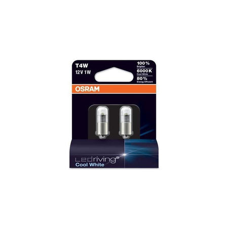 Lámpara LED retrofit OSRAM LEDriving PREMIUM T4W, referencia 3850CW-02B, casquillo BA9s, 12 V; potencia de entrada 1 W (0,8 W nominal); flujo luminoso 75 lm; temperatura de color 6000 K; dimensiones 27,4 × 9 mm (largo × diámetro); peso 2,7 g; vida útil B3 2500 h / Tc 5000 h; pack de 2 unidades; uso recomendado: interior de vehículo (no ECE para exterior).