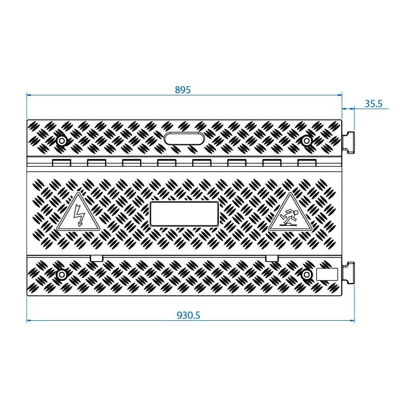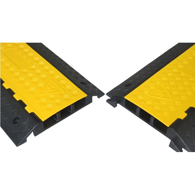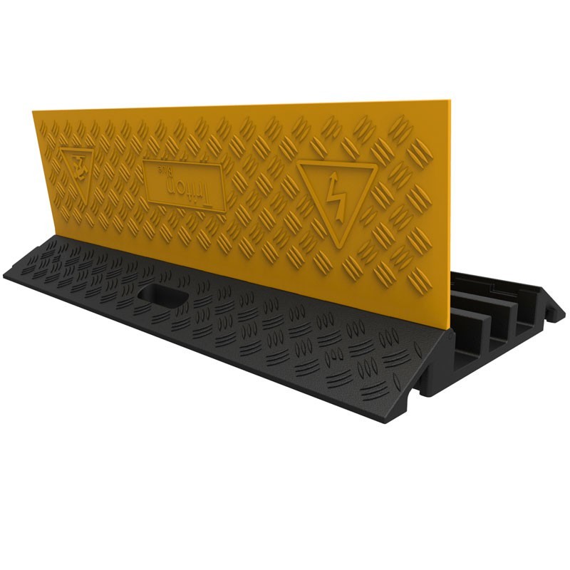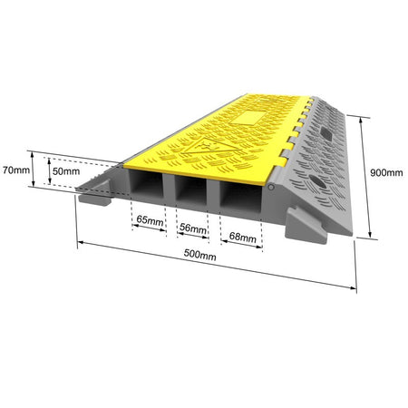 Pasacables modular de 3 canales con dimensiones nominales 900 × 500 × 70 mm (dimensiones reales 895 × 500 × 69,5 mm). Canales internos: 50 × 65 mm, 50 × 56 mm, 50 × 68 mm. Base de caucho vulcanizado y tapa amarilla de alta visibilidad; conectores macho/hembra para encadenar. Resistencia aprox. 9 t en superficie firme y nivelada. Resistente a aceites, ácidos e hidrocarburos. Peso aprox. 17,2 kg. Uso recomendado con cables ≤ 500 V y ocupación ≤ 70 % del canal.