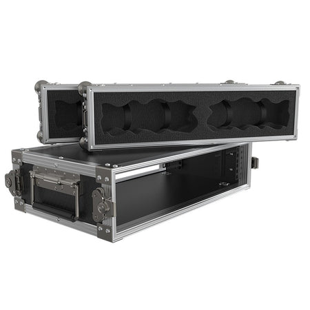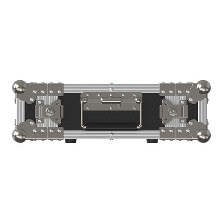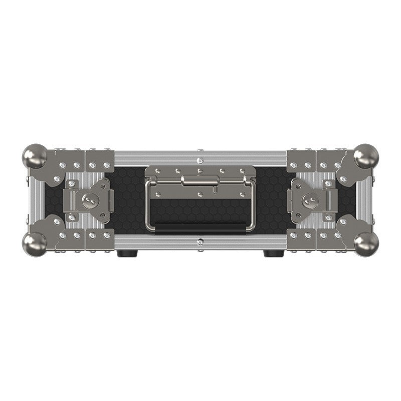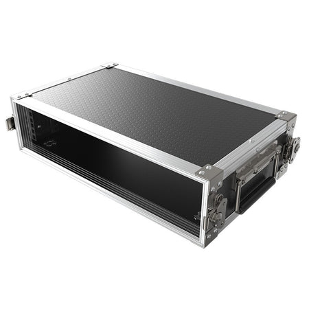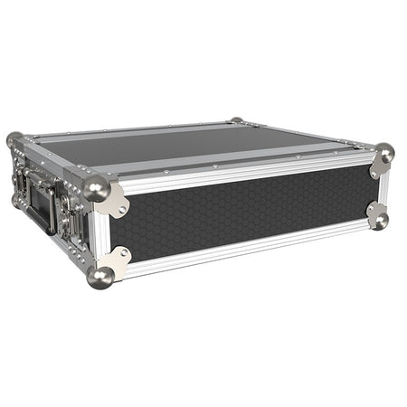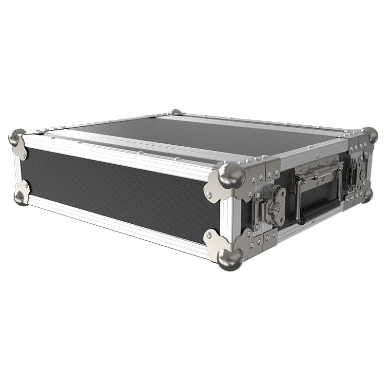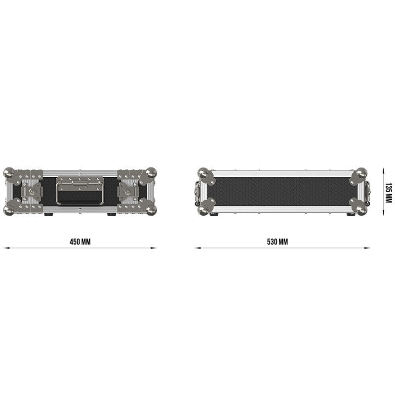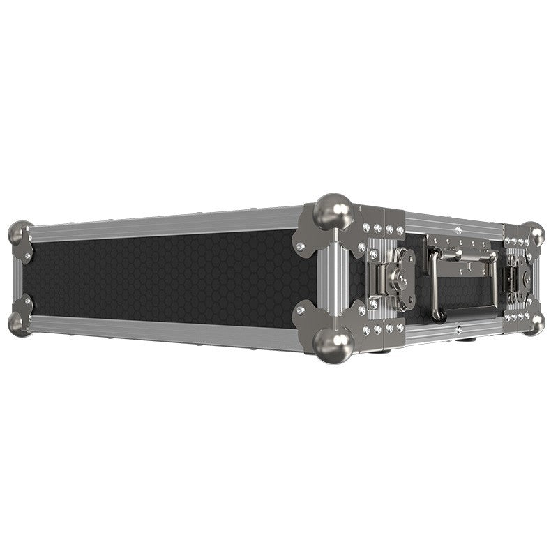 Flightcase de transporte formato rack 19 pulgadas con 2U de altura. Fabricado en madera contrachapada de 9 mm con acabado exterior PROBUCKLER antideslizante con textura hexagonal. Estructura reforzada con perfilería de aluminio de 35 mm y perfiles de rack para montaje de equipos en la parte delantera y trasera. Dispone de un fondo útil de 300 mm. Incluye tapas delantera y trasera desmontables con compartimentos de almacenaje integrados, 4 cierres de mariposa y 2 asas de superficie. Base equipada con 4 tacos de goma. Dimensiones exteriores (Largo x Alto x Ancho): 530 x 135 x 460 mm.