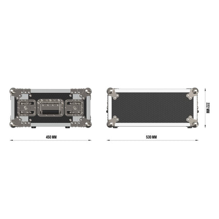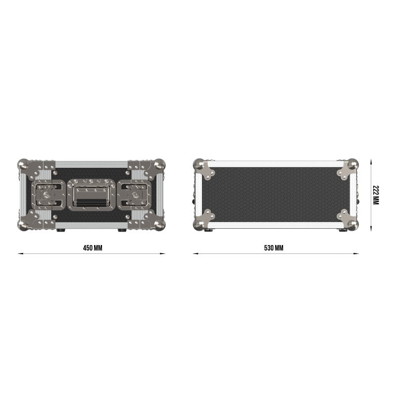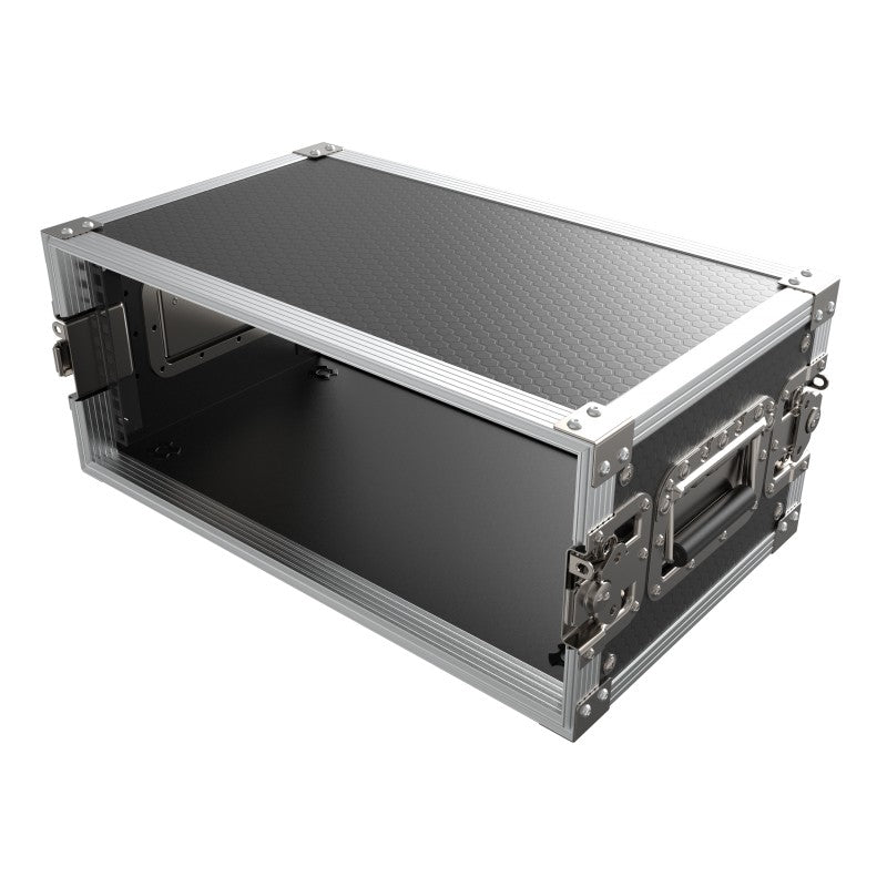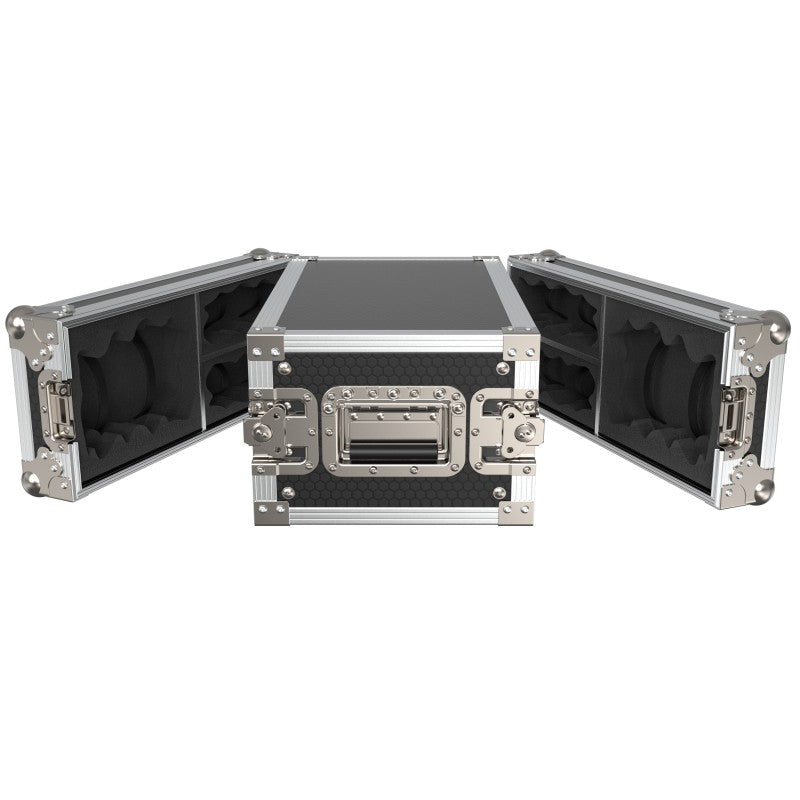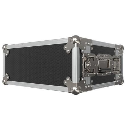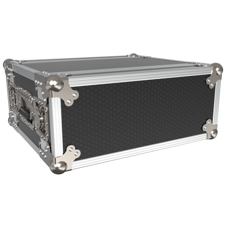 Flight case formato rack de 19 pulgadas con una altura de 4U. Construido en madera contrachapada de 9 mm con un acabado exterior texturizado PROBUCKLER. Dispone de perfiles de rack delanteros y traseros, ofreciendo una profundidad útil de 300 mm sin tapas. Equipado con tapas delantera y trasera desmontables que incluyen compartimentos de almacenamiento. Incorpora 2 asas de acero con muelle, 4 cierres de mariposa, ángulos de aluminio de 35 mm y 4 pies de goma en la base. Dimensiones exteriores con tapas: 514 x 241 x 460 mm.