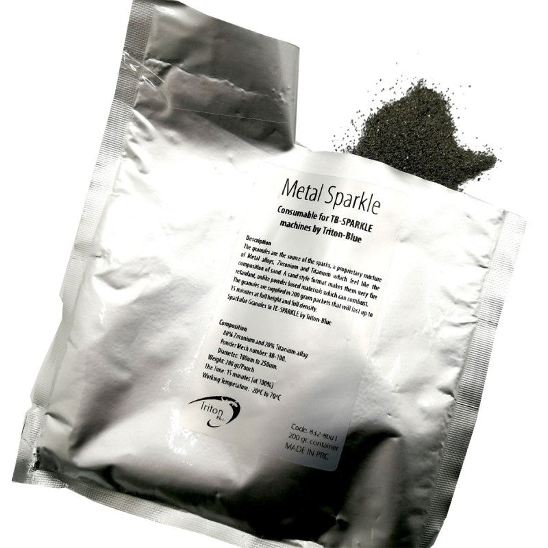 El Triton Blue MS200 es el consumible oficial en formato sobre de 200 g para las máquinas de chispas frías TB-SPARKLE. Sus gránulos, una mezcla patentada de aleaciones metálicas con 80 % de zirconio y 20 % de aleación de titanio, tienen una apariencia similar a la arena, lo que los hace muy ignífugos frente a materiales en polvo convencionales. Entregan un efecto de chispas metálicas sin humo y sin olor a pirotecnia y una autonomía de hasta 15 minutos por sobre a altura y densidad máximas. El producto llega envasado al vacío en bolsa de aluminio y cuenta con certificación RoHS.