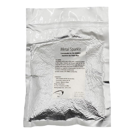 Consumible granulado para máquinas TB-SPARKLE: sobre 200 g; composición 80 % zirconio + 20 % aleación de titanio; malla 80–100, partículas 180–250 μm; autonomía hasta 15 min (a 100 %); sin humo ni olor; RoHS; rango térmico −20 °C a +70 °C; envase al vacío en bolsa de aluminio.