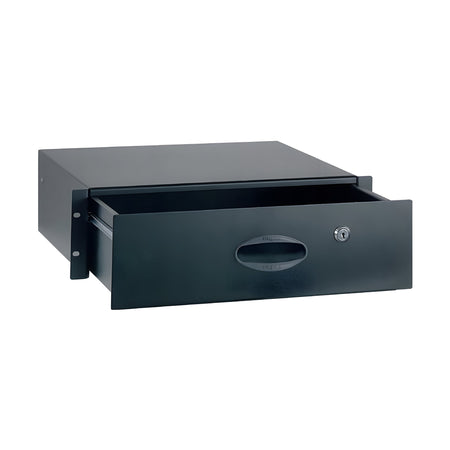 Cajón metálico para rack de 19 pulgadas con una altura de 3 unidades (3U). Construcción en acero sólido con acabado en pintura epoxi negra texturizada resistente a rayaduras. Sistema de apertura mediante guías telescópicas con recubrimiento de zinc para deslizamiento suave y protección anticorrosiva. Incluye cerradura de seguridad con llave integrada en el panel frontal y mecanismo de cierre por pestillo. Dimensiones interiores útiles de 405 mm de ancho x 340 mm de profundidad x 117 mm de altura.