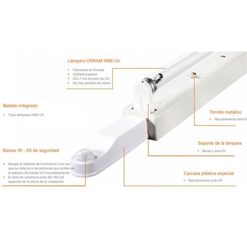 - Fuente UV-C: lámpara OSRAM PURITEC HNS T8, 36 W, 253,7 nm (sin emisión de ozono).