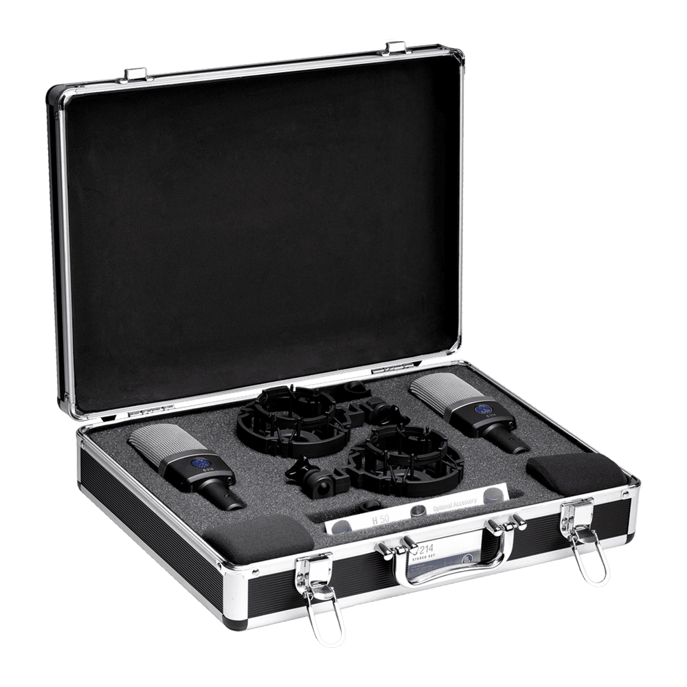 El set C214 ST se entrega con todo lo necesario para empezar a grabar en estéreo: 2 suspensiones elásticas H85, 2 pantallas antiviento W214, 2 adaptadores de pie SA60 y estuche metálico de transporte. Dimensiones por micrófono 160 × 55 mm (largo × diámetro) y peso 280 g.