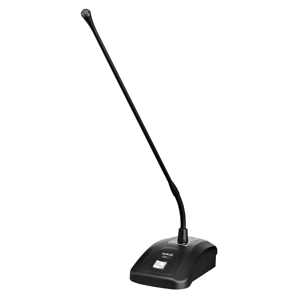 El AKG CGN521 STS es un conjunto profesional de micrófono de mesa que combina un cuello de cisne de 50 cm de línea delgada con una cápsula de condensador cardioide y una base metálica robusta. Su diseño prioriza la inteligibilidad en voz hablada en salas de conferencias, administraciones públicas, educación, lugares de culto y atriles. La directividad cardioide con ángulo de captación de 120° concentra la toma en el orador y reduce las fuentes laterales, mientras que la base maciza aporta excelente absorción de vibraciones para minimizar golpes de mesa y ruidos mecánicos. Incorpora botón programable (push-to-talk, push-to-mute, on/off y low cut on/off) y un LED cuadrado que indica con claridad el estado del micrófono, además de conector XLR de 3 pines bañado en oro con protección frente a interferencias EMC.