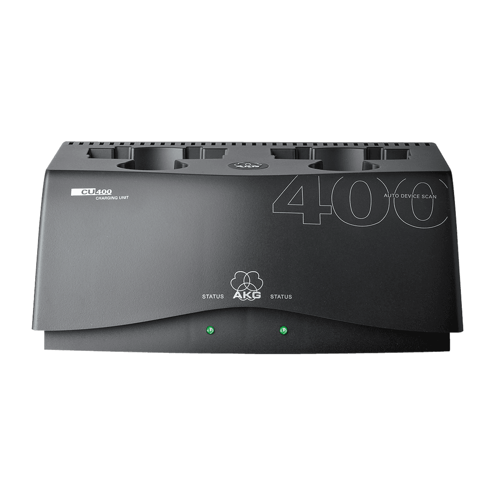 AKG CU400: base de carga dual para transmisores WMS420/450/470 (HT y PT). Alimentación 5 V DC / 1,5 A; control de temperatura/tensión; LED tricolor por ranura; tiempo de carga típico ≈ 1,5 h (1 ranura) / ≈ 3–4 h (2 ranuras); baterías admitidas NiMH/NiCd (≥1500 mAh); incluye 2 × AA NiMH y fuente 5 V con adaptadores EU/US/UK; dimensiones 188 × 115 × 78 mm; peso ≈ 420 g. No compatible con WMS40 MINI.
