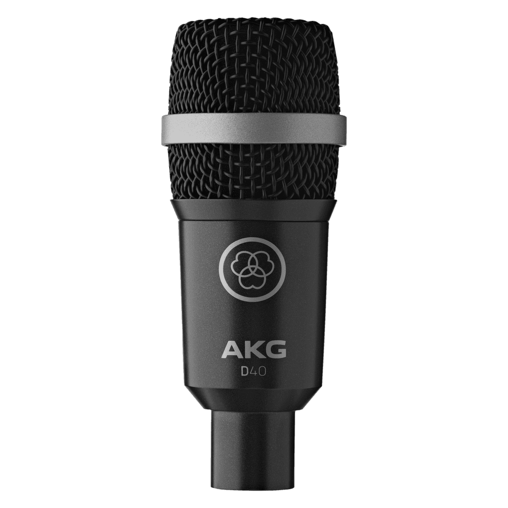 Micrófono dinámico de instrumento AKG D40 (cardioide); respuesta 50 Hz–20 kHz; sensibilidad 2,5 mV/Pa; SPL máx. 147/156 dB (1 %/3 % THD); impedancia de salida ≥ 600 Ω; carga recomendada ≥ 2.000 Ω; salida XLR 3 pines; cuerpo metálico con rejilla; incluye pinza H440 y bolsa; dimensiones 104 × 44 × 79 mm (L × Ø × H); peso 245 g; acabado dark stage blue.