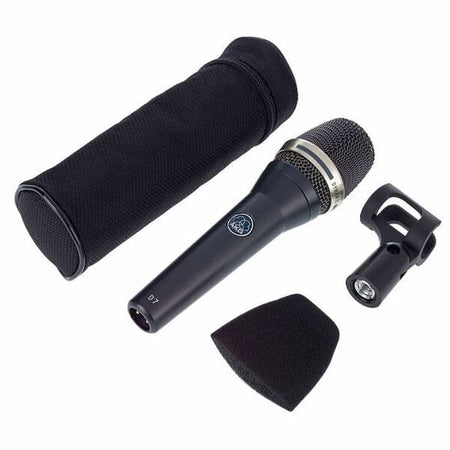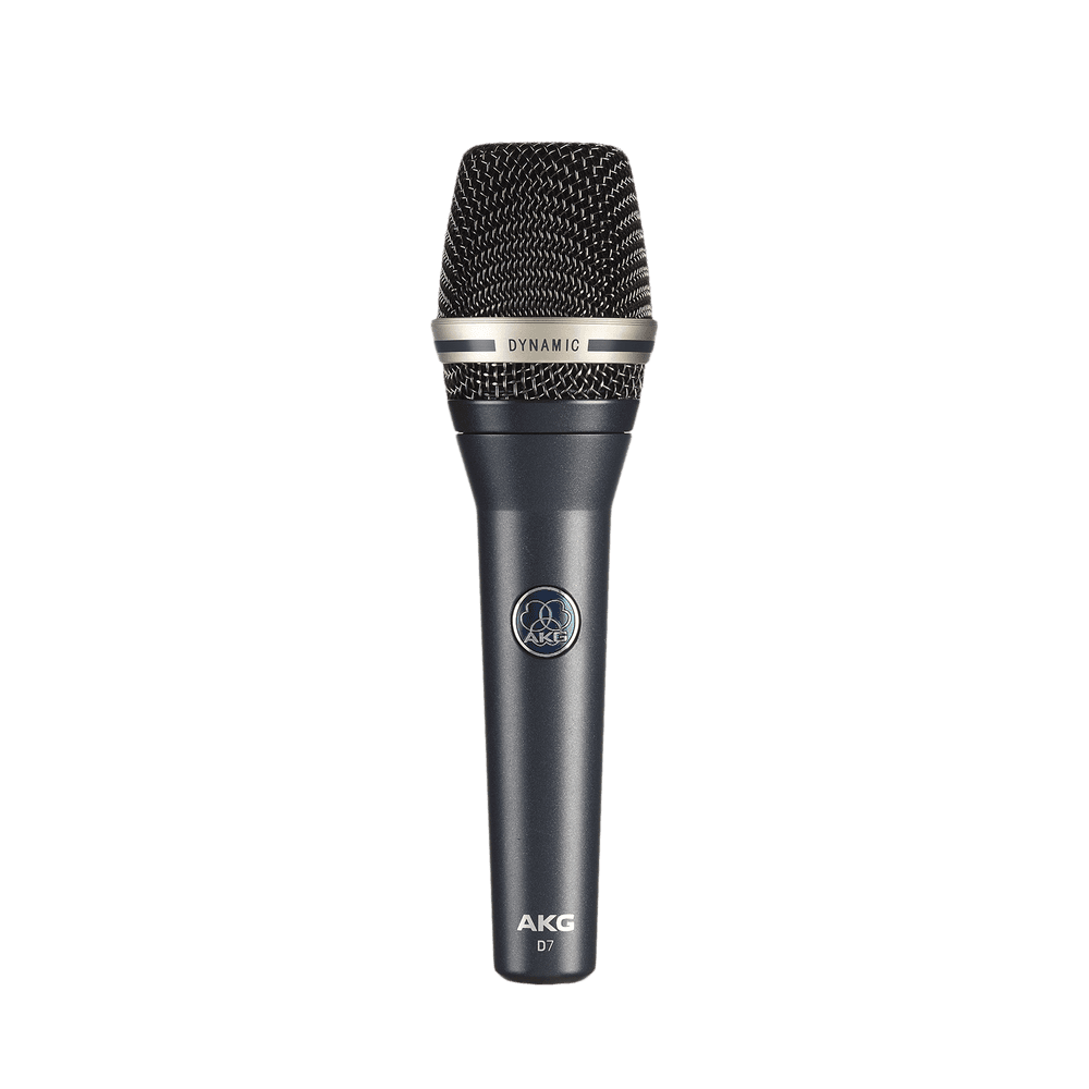 Micrófono dinámico supercardioide de mano AKG D7; respuesta 70 Hz–20 kHz; sensibilidad 2,6 mV/Pa (≈ −52 dBV); impedancia 600 Ω (carga recomendada ≥ 2.000 Ω); filtro paso alto 80 Hz integrado (siempre activo); máx. SPL 147/156 dB; diafragma laminado Varimotion, bobina hum-compensada y suspensión de cápsula; conector XLR 3 pines; dimensiones 185 × 51 mm; peso 340 g; incluye SA61, paraviento interior y bolsa.