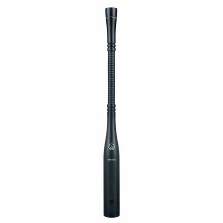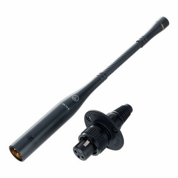 AKG GN15E, gooseneck modular para cápsulas DAM; cuello 15 cm (longitud total módulo ~235 mm), XLR macho 3 pines con adaptador phantom 9–52 V integrado; LED programable y filtro de graves conmutable ~250 Hz; PS3 F-Lock incluido; compatible con cápsulas CK31/CK32/CK33/CK47/CK80.