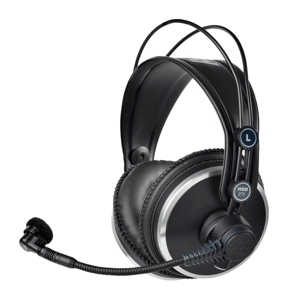 Headset profesional cerrado circumaural AKG HSD271 con micrófono dinámico hipercardioide. Auriculares: 16–28.000 Hz, 55 Ω, alta sensibilidad (104 dB SPL/V a 1 kHz). Micrófono: 60–17.000 Hz, 1 mV/Pa, 600 Ω. Funciones: auto-mute de micrófono al levantar la pértiga y auto-mute de auriculares al retirarlos. Cable incluido AKG MK HS Studio D, 3 m, mini XLR 6 pines a TRS 6,35 mm (auriculares) + XLR 3 pines (micrófono). Color negro mate.