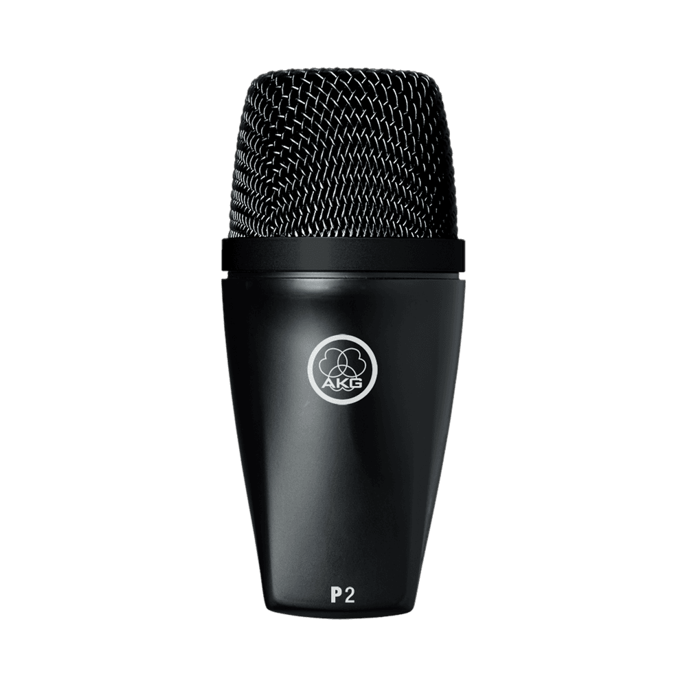 Micrófono dinámico cardioide AKG P2; 20–16.000 Hz; SPL máx. 157 dB; sensibilidad 2,5 mV/Pa (≈ –52 dBV/Pa); impedancia 400 Ω (carga recomendada ≥ 2 kΩ); salida XLR 3 pines balanceada; soporte integrado rosca 3/8"; cuerpo metálico acabado negro con bobina humbucking; dimensiones 130 × 60 mm; peso 400 g; incluye bolsa.
