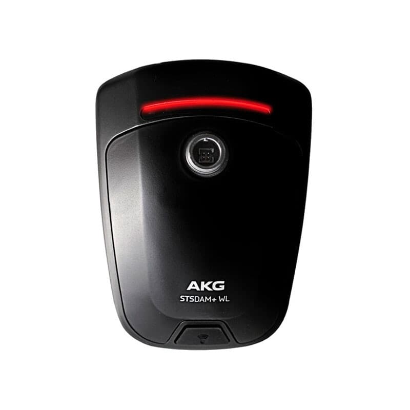 Base inalámbrica de sobremesa AKG STS DAM+ WL para cuellos de ganso DAM+: producto “wireless tabletop stand with mute switch”; color negro mate; transmisores compatibles PT40/45/420/450/470 y DPT800; módulos/cápsulas DAM+ GN15/30/50M + CK41/CK43/CK49; entrada minijack 3,5 mm (cascada hasta 3× CBL410); batería del soporte 1× AA; dimensiones 145 × 107 × 45 mm; peso neto 960 g (bruto 1.010 g); uso típico salas de reuniones, tribunales, conferencias y culto.