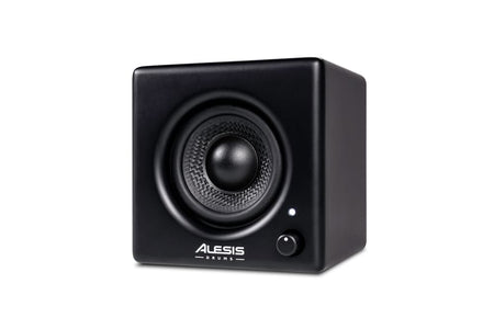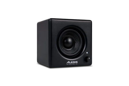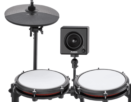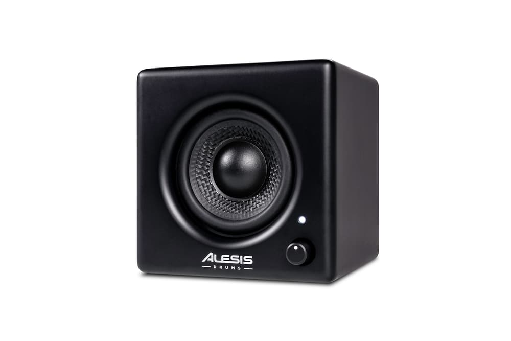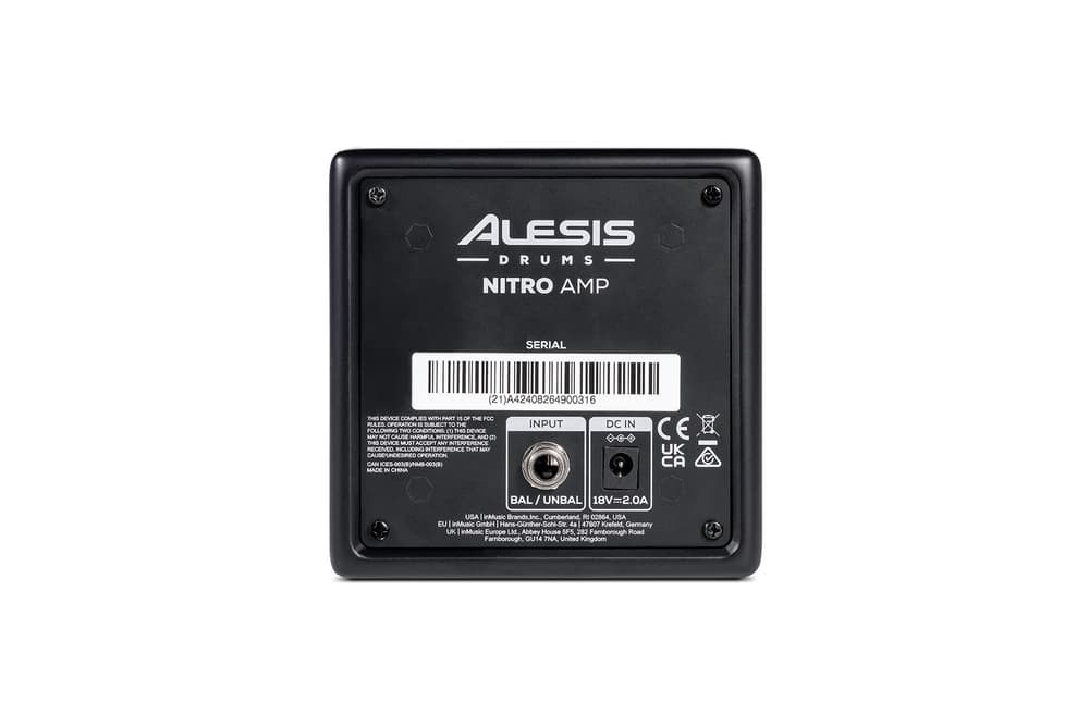 Monitor personal para batería electrónica Alesis Nitro: driver 3” de rango completo; 70 W (pico) Class-D; 98 dB SPL máx.; 120 Hz–18 kHz; entrada TRS 6,35 mm balanceada/no balanceada; control frontal de volumen/encendido; montaje en rack con abrazaderas para Ø37,5 mm y Ø28,0 mm; alimentación DC 18 V / 2,0 A (centro positivo); dimensiones 11,4 × 11,4 × 10,9 cm; peso 1,5 kg; incluye cable TRS 1/4”, abrazaderas y brazo de montaje.