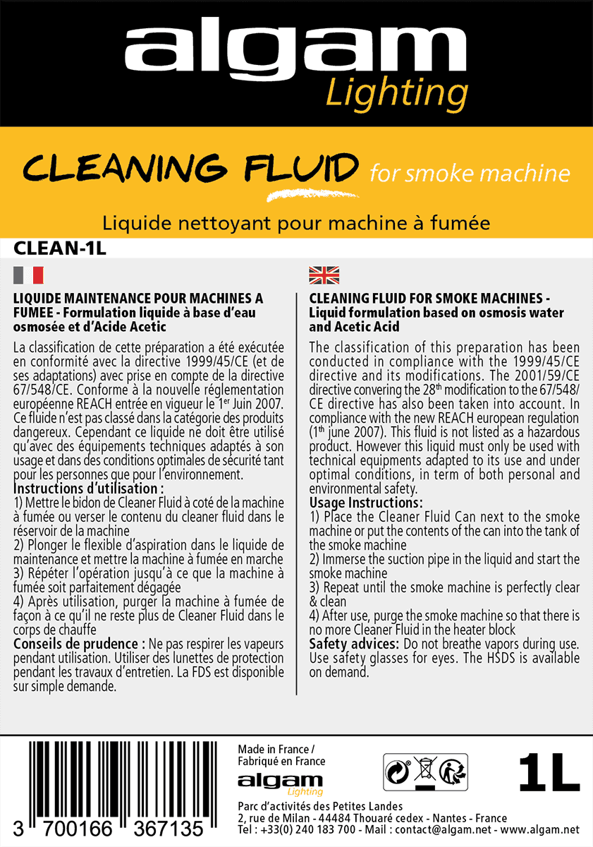 El Algam CLEAN-1L es un limpiador especializado formulado para el mantenimiento de máquinas de humo y niebla. Su composición neutra y de baja viscosidad disuelve residuos de glicol y proteínas acumulados en resistencias, boquillas y conductos, restaurando el rendimiento óptimo del equipo y prolongando su vida útil. Compatible con la mayoría de fluidos de humo, se suministra en un práctico envase de 1 L que facilita dosificar la cantidad necesaria sin desperdicios.