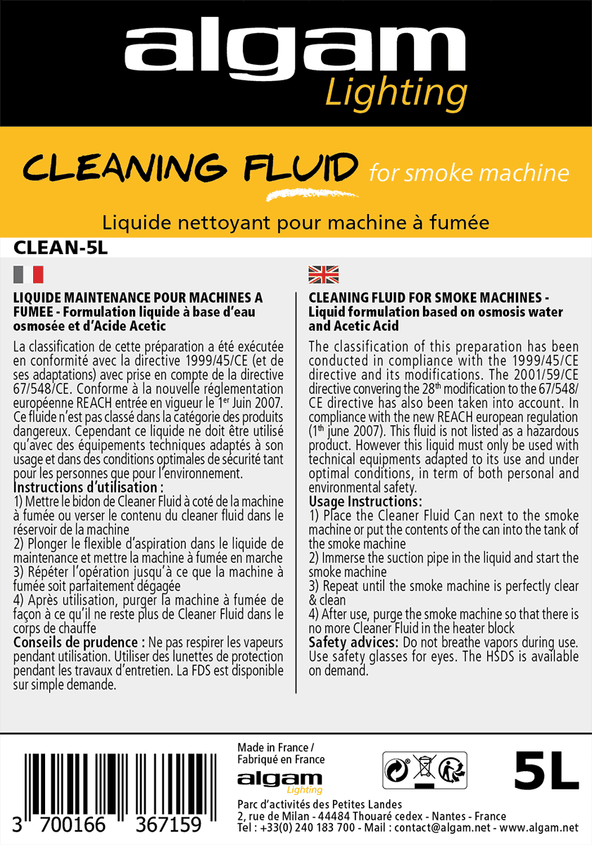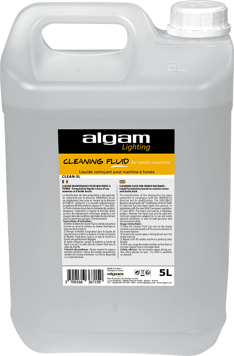 Algam CLEAN-5L es un líquido de mantenimiento profesional, especialmente formulado para la limpieza y desobstrucción de máquinas de humo y niebla. Con una capacidad de 5 L, su fluido neutro penetra y disuelve los depósitos de glicerina y propilenglicol en el circuito y la unidad calefactora, evitando atascos y averías. Fabricado en Francia bajo un estricto control de calidad y cumpliendo con las normativas vigentes, CLEAN-5L garantiza un flujo óptimo de humo, alarga la vida útil de tu equipo y mantiene un rendimiento constante sin residuos ni manchas.