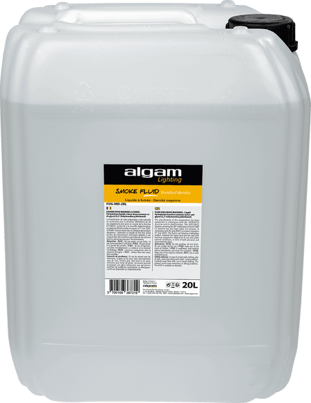 Fluido de humo media densidad en botella de 20 L, base agua/glicol, incoloro y sin aceite, compatible con máquinas heater-based, no tóxico y no inflamable.