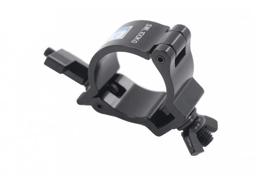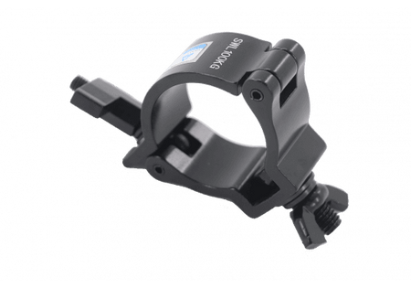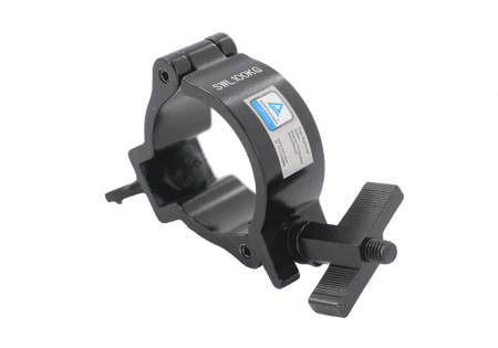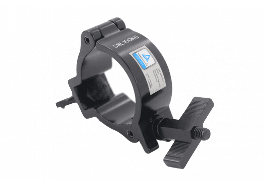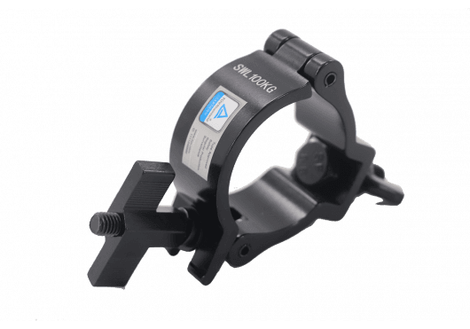 Abrazadera de acero regulable 48–51 mm, capacidad 100 kg, tornillo M10 con pomo, acabado negro mate, compatible con truss y lyres.