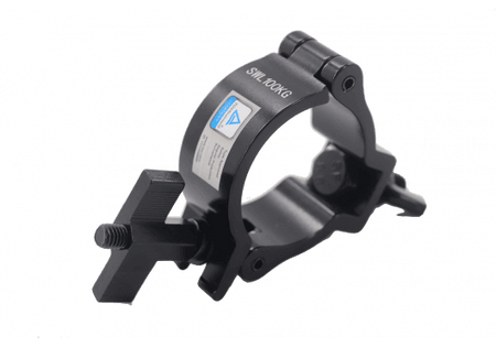 La abrazadera Algam HCB-4851-100KG es un accesorio de rigging profesional diseñado para fijar de forma rápida y segura tuberías y perfiles de iluminación de diámetros entre 48 y 51 mm. Fabricada en acero de alta resistencia con recubrimiento negro mate, soporta cargas de hasta 100 kg sin deformarse. Su tornillo de apriete M10 con pomo moleteado facilita el montaje manual, ofreciendo un ajuste firme en estructuras truss, lyres y soportes de escenario.