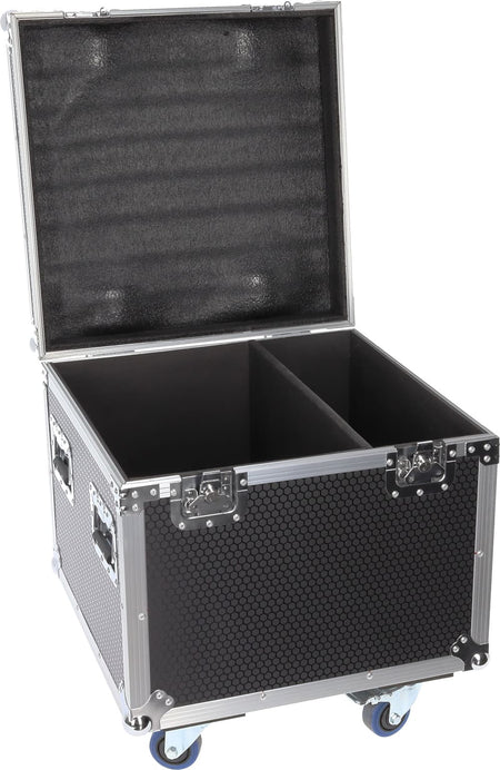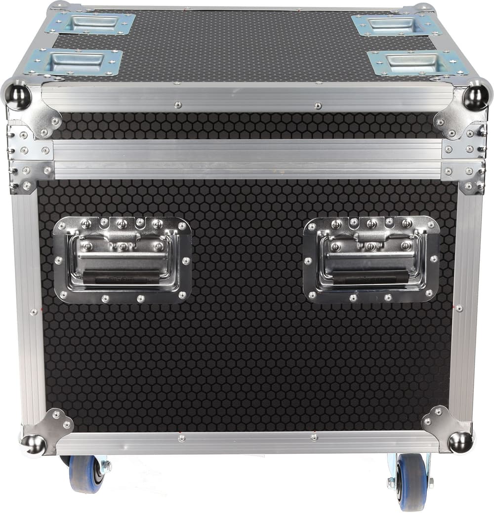 Flight case de madera multilámina con espuma de alta densidad, compatible con Nebel 2000 ABS, 4 ruedas giratorias (2 con freno), 2 asas empotradas, cantoneras tipo bola, 4 cierres mariposa y compartimento alvéolo lateral para accesorios.