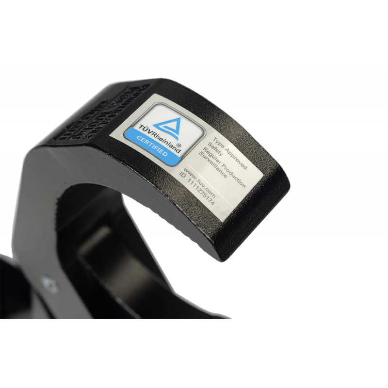 Pack de 24 abrazaderas universales en aluminio negro, con tuerca hexagonal, compatibles con tubos de Ø42–60 mm, capacidad de carga 100 kg, certificadas TÜV Rheinland.