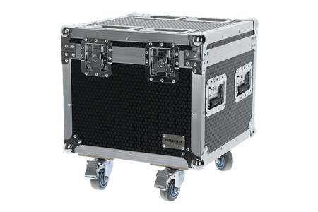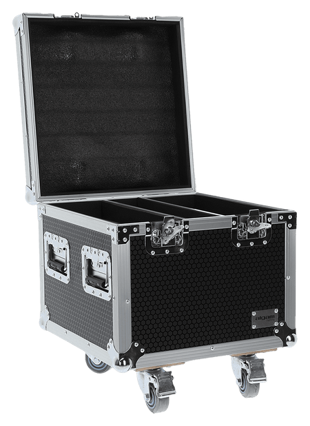 Flight case de madera multilámina con espuma de alta densidad, compatible con 2 FL600V-IP, 4 ruedas giratorias (2 con freno), 2 asas empotradas, esquinas metálicas tipo bola, 4 cierres mariposa, compartimento central, 620×590×390 mm.