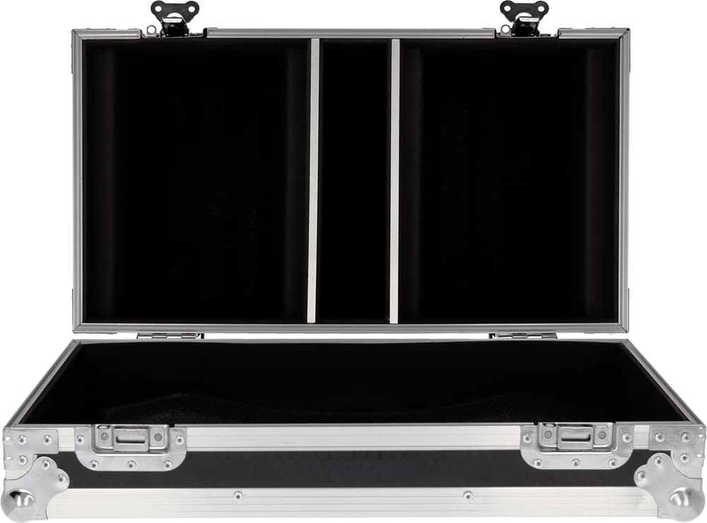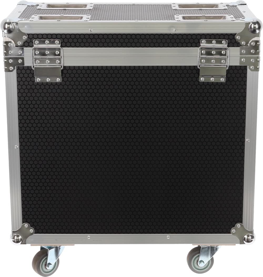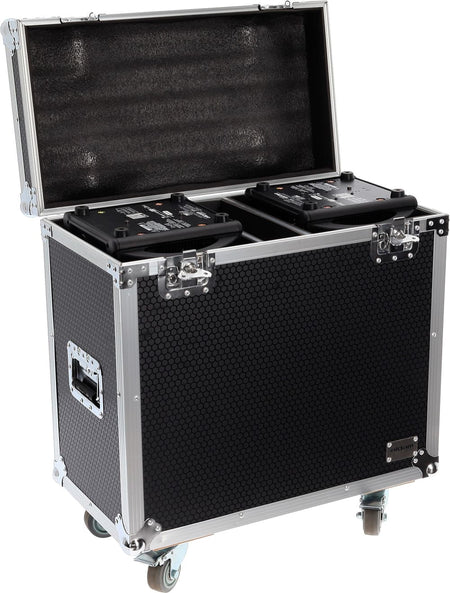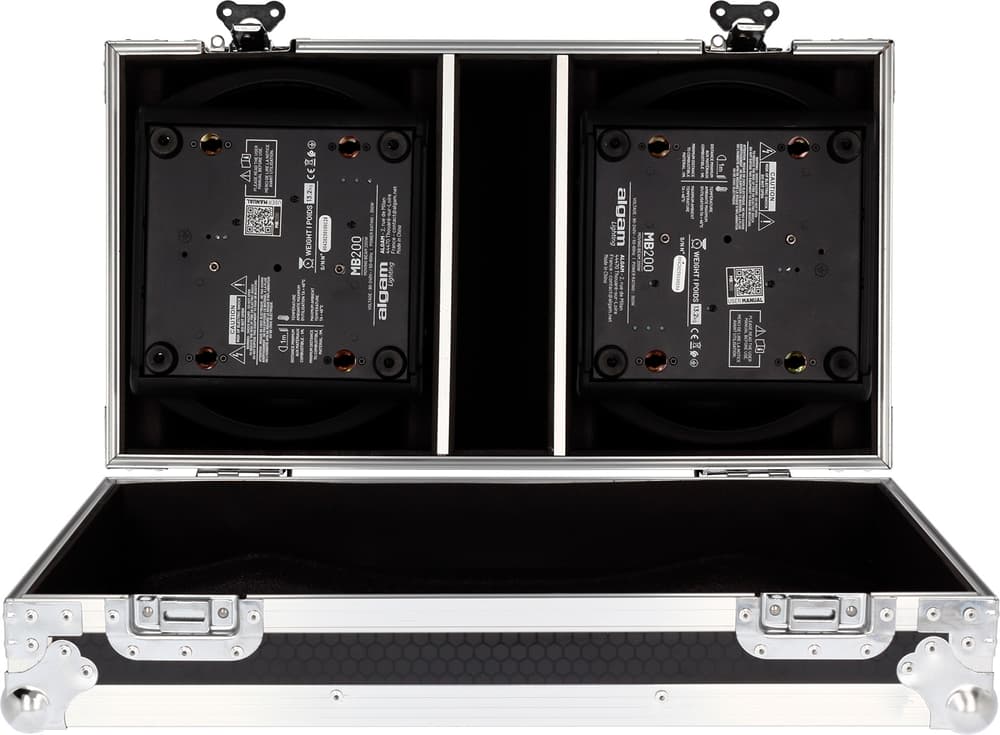 Flight case de madera multilámina y espuma de alta densidad, 2× MB200, 4 ruedas (2 con freno), 2 asas empotradas, 4 cierres mariposa, esquinas tipo bola, compartimento central para accesorios.