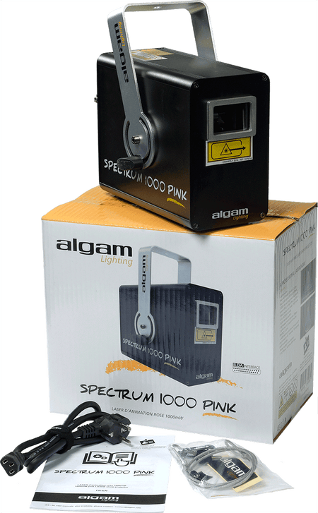 El Algam SPECTRUM1000PINK es un láser de animación monocromático de clase 3B (clase 4 en algunos mercados) que combina un diodo rojo de 500 mW (638 nm) y un diodo azul de 500 mW (450 nm) para generar potentes haces rosas. Equipado con escáneres galvánicos de 20 kpps y 2 000 programas internos predefinidos, ofrece efectos de túnel, ondas, gráficos y animaciones con modos Auto, Musical y DMX. Su chasis de aluminio y sistema de refrigeración por ventilador garantizan durabilidad y funcionamiento continuo en interiores.