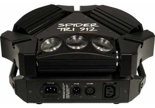 Sistema SPIDER con 3 brazos motorizados 360 °, 9×12 W RGBW, modos Auto/Música/Maestro/DMX (16–48 ch), XLR DMX, 90 W, 540×530×260 mm, 6 kg, IP20.