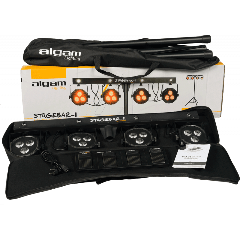 El Algam Stagebar II es un completo sistema de iluminación para DJs, bandas y montajes itinerantes que combina cuatro PAR LED RGB de 3×9 W con cuatro LEDs blancos de 1 W para efecto estroboscópico. Montable en su robusto trípode telescópico de 1,5–2,5 m en cuestión de segundos, ofrece modos Automático, Detección de Música, Maestro/Esclavo y DMX (3, 5 o 24 canales). Incluye pedal inalámbrico para disparo a pie y micrófono interno para sincronizar los efectos al ritmo, garantizando shows dinámicos y profesionales con mínima configuración.
