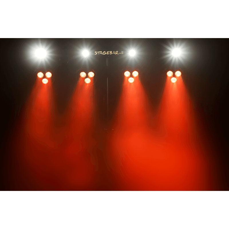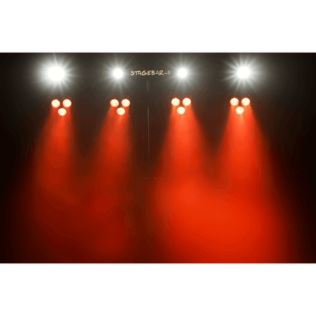 Sistema Stagebar II con 4×3×9 W PAR RGB, 4×1 W estrobo, modos Auto/Música/Maestro/DMX (3–24 ch), XLR 3 pines, pedal inalámbrico, pantalla digital, trípode 1,5–2,5 m, 84 W, 10,2 kg.