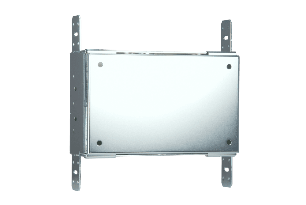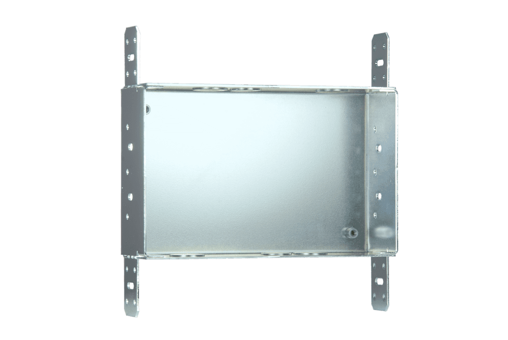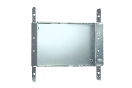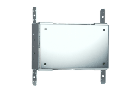 Caja de preinstalación (Rough-in Box) metálica para montaje empotrado en pared, diseñada específicamente para paneles táctiles de 7 pulgadas de las series Modero X, Modero S, Modero G5 y Acendo Book. Fabricada en acero galvanizado, incluye pestañas de montaje para fijación directa a montantes estructurales y orificios pretroquelados para la gestión de cableado. El kit incorpora una placa de cubierta temporal para protección contra escombros y polvo durante la fase de construcción, así como la tornillería necesaria para el ensamblaje de la caja y la cubierta. Certificaciones UL y cTUVus.