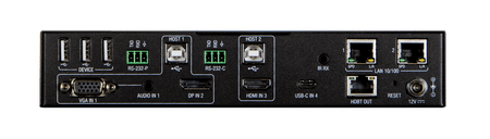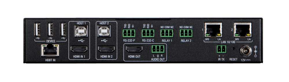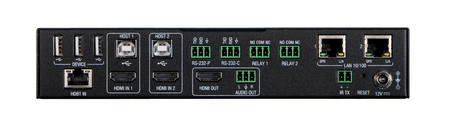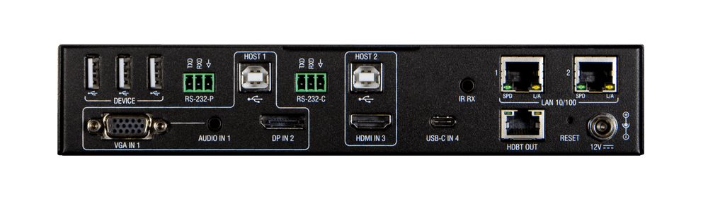 - Distribución inteligente de USB 2.0: Permite compartir dinámicamente cámaras, micrófonos y pantallas táctiles USB entre los dispositivos fijos de la sala (como un PC dedicado) y los portátiles de los invitados.