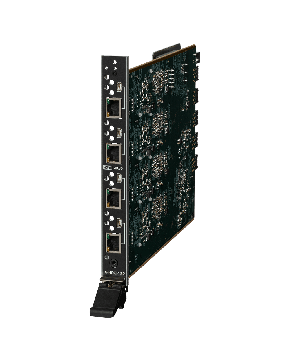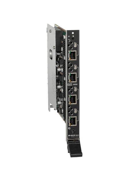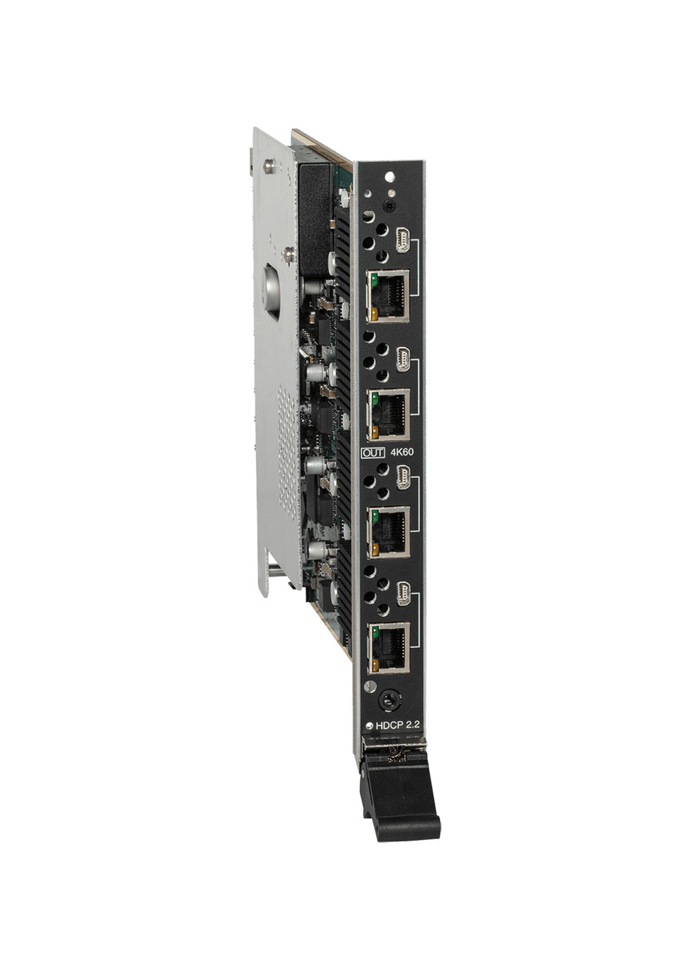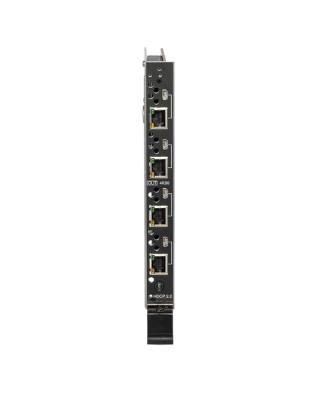 Placa de salida de cuatro puertos para chasis Enova DGX. Proporciona transmisión de vídeo 4K a 60 Hz con submuestreo de croma 4:4:4, audio digital, control bidireccional (IR, RS-232), Ethernet y USB 2.0 sobre un único cable de par trenzado de hasta 100 metros. Es compatible con los estándares HDMI 2.0, HDCP 2.2, HDR10 y Deep Color de 36 bits. Cumple con el estándar HDBaseT, ofrece alimentación a través de DXLink (PoDX) y es intercambiable en caliente.