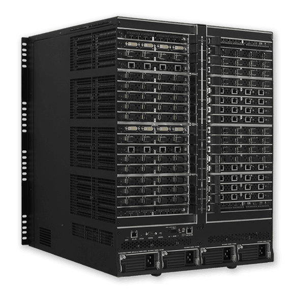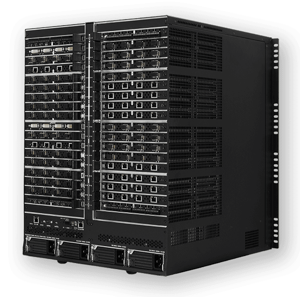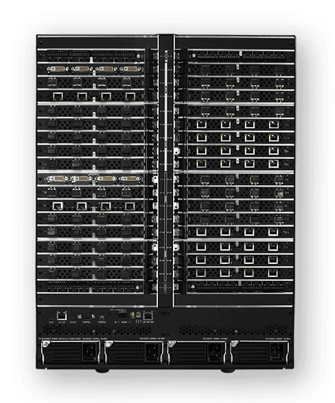 Chasis de conmutación de medios digitales modular con capacidad para una matriz de hasta 64x64. Admite resoluciones 4K60 4:4:4, UHD y HDR. Dispone de 16 ranuras para tarjetas de entrada y 16 para tarjetas de salida, intercambiables en caliente y compatibles con formatos HDMI/HDCP, DXLink sobre par trenzado y DXLink sobre fibra óptica (monomodo/multimodo). Incluye un controlador de sistema NetLinx NX integrado, dos fuentes de alimentación redundantes e intercambiables en caliente, y un conmutador Ethernet. Incorpora tecnología de escalado SmartScale en las salidas y conmutación HDCP InstaGate Pro. Ofrece gestión a través de interfaz web integrada y seguridad de red con doble NIC, IPv6, 802.1X y LDAP.