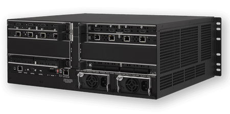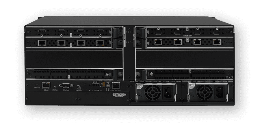 - Conectividad Flexible: Soporta placas de E/S intercambiables en caliente para par trenzado (DXLink) y fibra óptica (monomodo y multimodo), permitiendo la transmisión de señales a distancias de hasta 10 km.