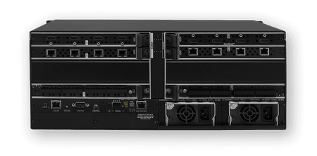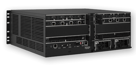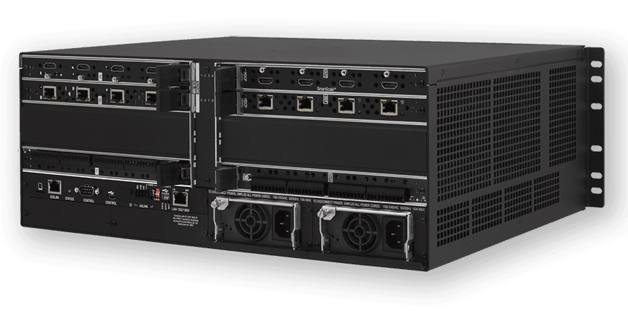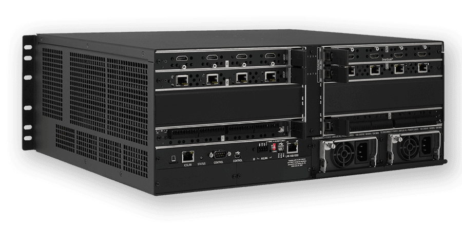 Chasis para conmutador de medios digitales modular con capacidad para una matriz máxima de 8x8. Admite resoluciones de video de hasta 4K y UHD (4096x2160). Incorpora un controlador de sistema NetLinx NX, un switch Ethernet de 7 puertos y dos fuentes de alimentación redundantes e intercambiables en caliente. El chasis cuenta con 2 ranuras para placas de entrada y 2 ranuras para placas de salida, compatibles con E/S HDMI, DXLink sobre par trenzado y DXLink sobre fibra óptica (monomodo/multimodo). Incluye tecnología de escalado de video SmartScale en las salidas, conmutación de contenido protegido HDCP mediante InstaGate Pro y soporte para audio multicanal, incluyendo Dolby TrueHD y DTS-HD Master Audio. La configuración se realiza a través de una interfaz web integrada. Ofrece seguridad de red con doble NIC, 802.1X, IPv6 y soporte LDAP.