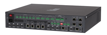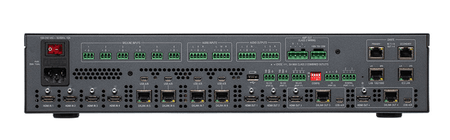 El AMX Enova® DVX-3266-4K es una solución integral y unificada de conmutación y control audiovisual, diseñada para los entornos profesionales más exigentes. Este potente dispositivo todo en uno centraliza las funciones de controlador, matriz de conmutación, escalador de vídeo, procesador de audio, amplificador y distribución por par trenzado en un robusto chasis de 2U. Al reemplazar múltiples componentes individuales, el DVX-3266-4K no solo ahorra un valioso espacio en el rack, sino que también elimina los complejos desafíos de integración y programación, garantizando una fiabilidad superior y un menor coste total de propiedad.
