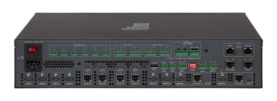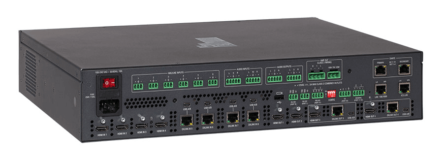 Conmutador de presentación todo en uno con matriz 8x4+2 y controlador integrado en chasis de 2U. Soporta resoluciones de vídeo hasta 4K a 60Hz con submuestreo 4:4:4, HDMI 2.0 y HDCP 2.2. Dispone de 4 entradas HDMI y 4 entradas DXLink-4K60, junto con 2 salidas HDMI y 2 salidas DXLink-4K60 con escalado SmartScale. Integra procesador de audio DSP BSS, supresor de feedback dbx y amplificador Crown DriveCore de 2x120W a 4/8 ohmios o 1x120W a 70/100V. Incluye 8x8 canales de audio sobre IP Dante, enrutamiento USB 2.0, y puertos de control RS-232, IR y relés. La configuración se realiza vía interfaz web HTML5. Posee doble puerto LAN para aislamiento de red (ICSLan), y soporta protocolos de seguridad 802.1X y LDAP.