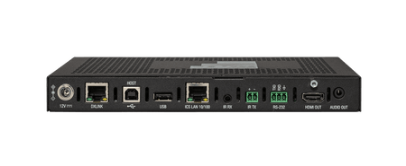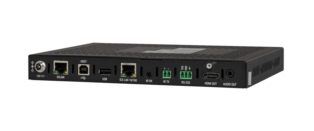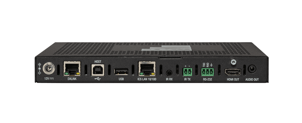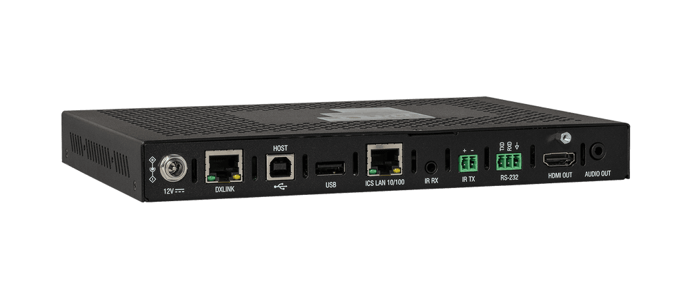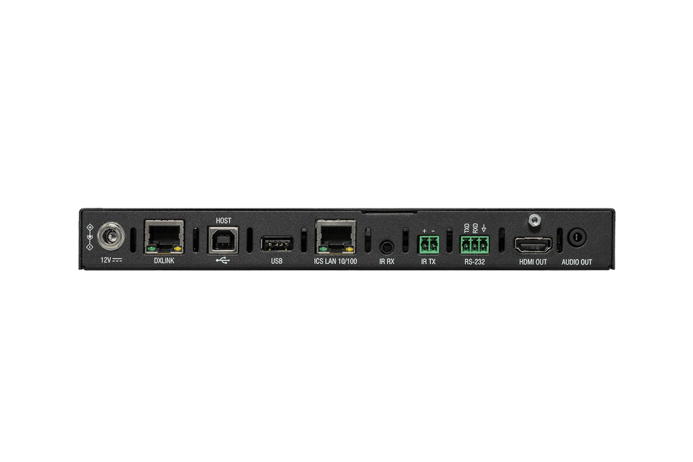Módulo receptor para la transmisión de señales a través de cable de par trenzado blindado Cat6A/Cat7 hasta 100 metros. Soporta resoluciones de vídeo hasta 4096x2160 a 60Hz con submuestreo de croma 4:4:4, cumpliendo con los estándares HDMI 2.0 y HDCP 2.2. Es compatible con HDR10 y Deep Color de 36 bits. Incorpora tecnología de escalado SmartScale®. Transporta vídeo, audio (Dolby TrueHD, DTS-HD MA, LPCM 8-Canales), Ethernet 10/100 (ICSLan), control bidireccional RS-232 e IR, y USB 2.0. Dispone de una salida HDMI, una salida de audio analógico estéreo y conectividad para control y USB. Alimentación local o remota (Power over DXLink).