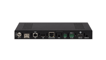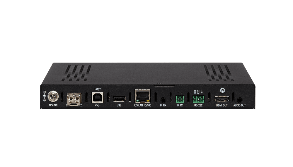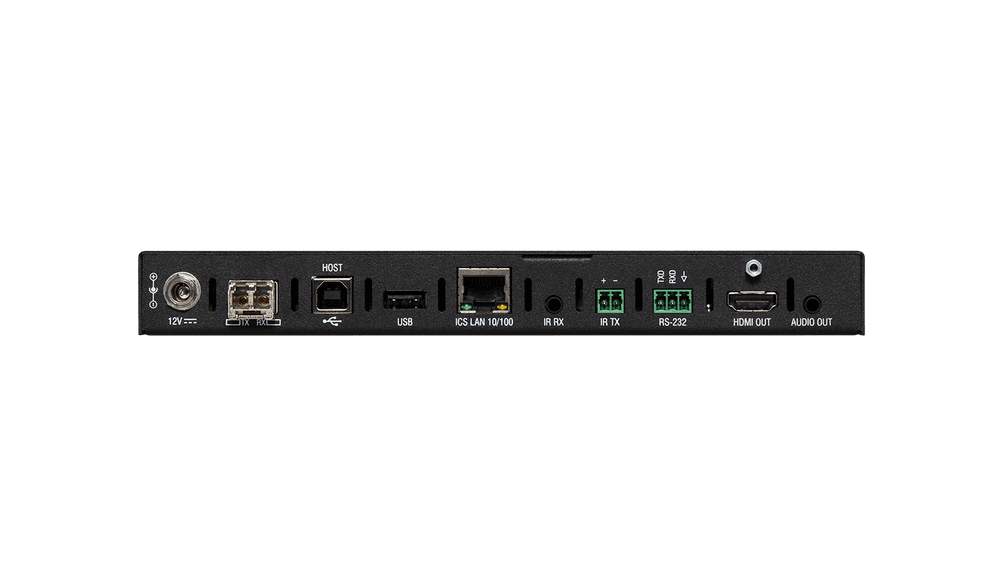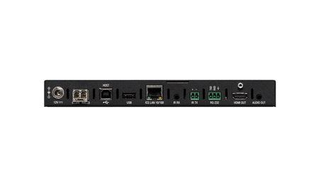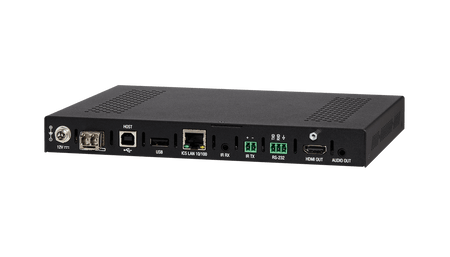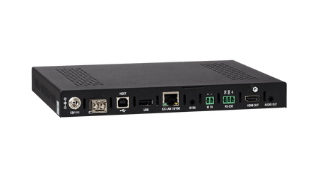 Módulo receptor de fibra óptica para la transmisión de señales AV y de control. Soporta resoluciones de vídeo hasta 4K60 con submuestreo de croma 4:4:4 a través de un único cable de fibra. Cumple con los estándares HDMI 2.0, HDCP 2.2 y es compatible con HDR (Alto Rango Dinámico) y Deep Color de 36 bits. Dispone de un puerto de entrada de fibra óptica SFP+, una salida HDMI y conectividad USB 2.0 para la extensión de periféricos. Incluye un módulo SFP+ multimodo para distancias de hasta 300 m y es compatible con módulos monomodo para distancias de hasta 10 km. La unidad puede alimentarse localmente o a través de un dispositivo AMX compatible.