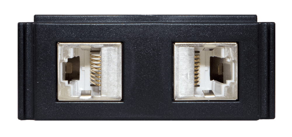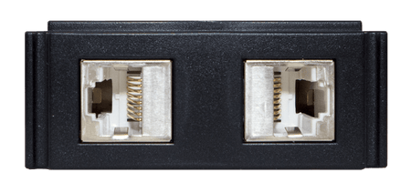 Módulo de conexión de red para sistemas modulares AMX HydraPort. Cuenta con un conector RJ45 hembra frontal y un conector RJ45 hembra trasero. El componente está clasificado como Categoría 6 (Cat6) y presenta un diseño de doble blindaje para la protección contra interferencias EMI/RFI. Soporta velocidades de transmisión de datos de hasta 10 Gbps. Su formato corresponde a 0.5 unidades de módulo HydraPort. No compatible con el chasis HPX-1600 debido a su profundidad extendida.
