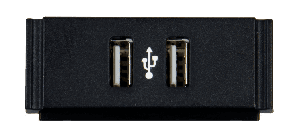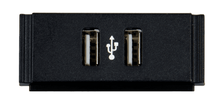 Módulo de conectividad dual para chasis AMX HydraPort. Proporciona dos conexiones USB 2.0. El panel frontal dispone de dos puertos USB Tipo A hembra. El panel trasero está equipado con dos cables USB integrados de 1.83 metros de longitud con terminación en conector USB Tipo A macho. El módulo ocupa 1 unidad de espacio HydraPort y presenta un acabado en color negro con un símbolo USB impreso para su identificación.