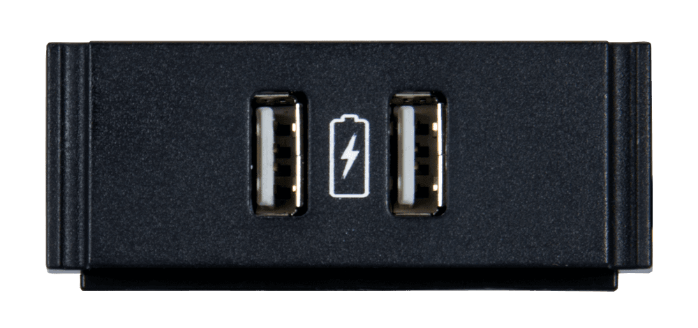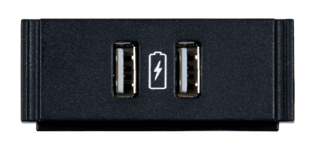 Módulo de alimentación con dos puertos USB tipo A para chasis AMX HydraPort. Ocupa una unidad de espacio HydraPort. Incluye símbolo de carga impreso para fácil identificación. Se suministra con una fuente de alimentación externa modelo PSU2.1 que proporciona 2.1A por puerto (4.2A total) y cuatro adaptadores de corriente internacionales (NA, UK, EU, AU/NZ). Los puertos son exclusivamente para carga, sin transferencia de datos. Fabricado en plástico ABS.